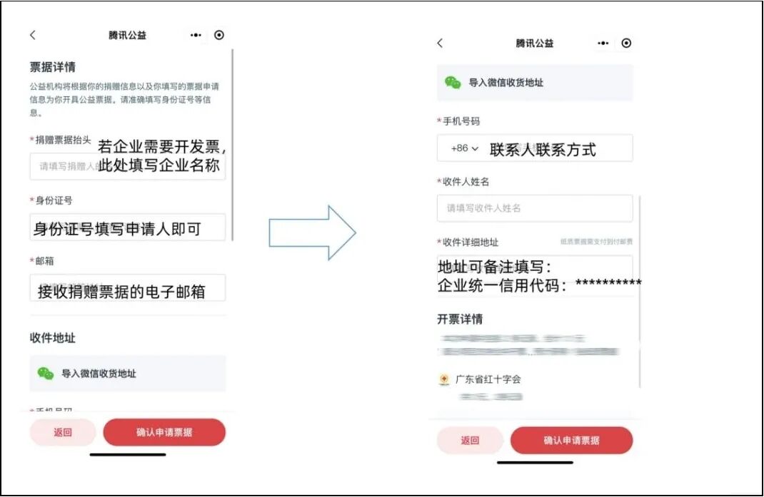 票据申请流程: 请进入“腾讯公益”小程序首页→点击“我的”→点击“捐赠票据”→点击“待开票捐赠”→选择要开具票据的项目及金额→填写开票信息→等待机构审核后开具电子票据发送至手机或邮箱。(特别提醒:申请票据请在捐赠后2个月内进行操作,逾期将无法在腾讯公益小程序上申请,同一项目多个捐款人填写同一开票名称的,金额合计后统一开到一张票据。)